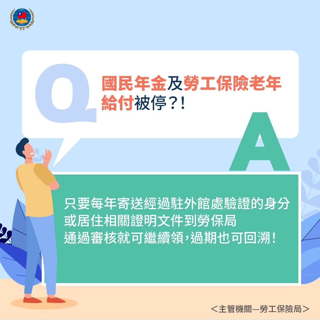 勞動部勞工保險局表示,可以檢附我駐外館處開立並驗證之「居住證明」,連同已簽名的我國護照資料頁影本,郵寄相關單位。