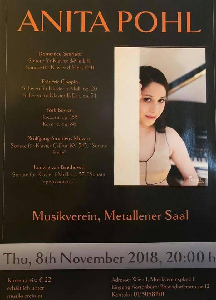 台灣僑民第二代鋼琴家Anita POHL訂於11月8日(週四)晚間8時在 Metallener Saal, Musikverein 舉辦個人鋼琴演奏會,相關內容請參考所附演出文宣,歡迎各位僑領並邀奧國友人蒞臨,共同支持新生代鋼琴家!!