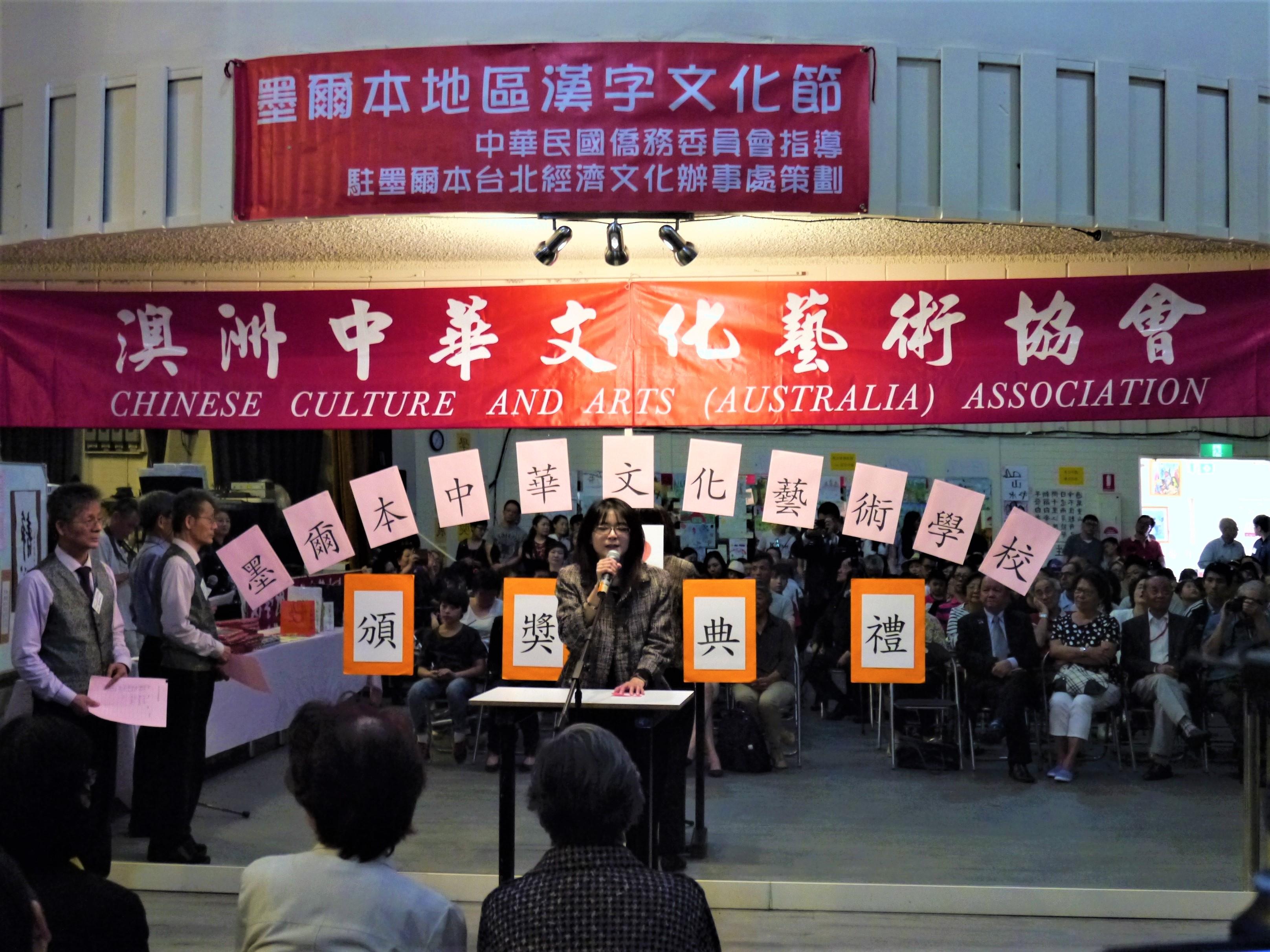 墨爾本中華文化藝術學校於本(106)年11月11日至12日舉行10 6年正體漢字文化節活動,計有墨爾本地區近10所僑校、250多位學生參賽,11月12日下午在同路人社區劇院舉辦成果發表及頒獎典禮。本處陳處長瓊玉偕同仁應邀出席,另萬年興(Manningham)市前市長楊千慧、僑務委員劉國強、僑務顧問鄭毅中、僑務促進委員暨維州華校協會會長楊瑾玲等僑領、僑校校長及教師以及學生等約逾300人與會。