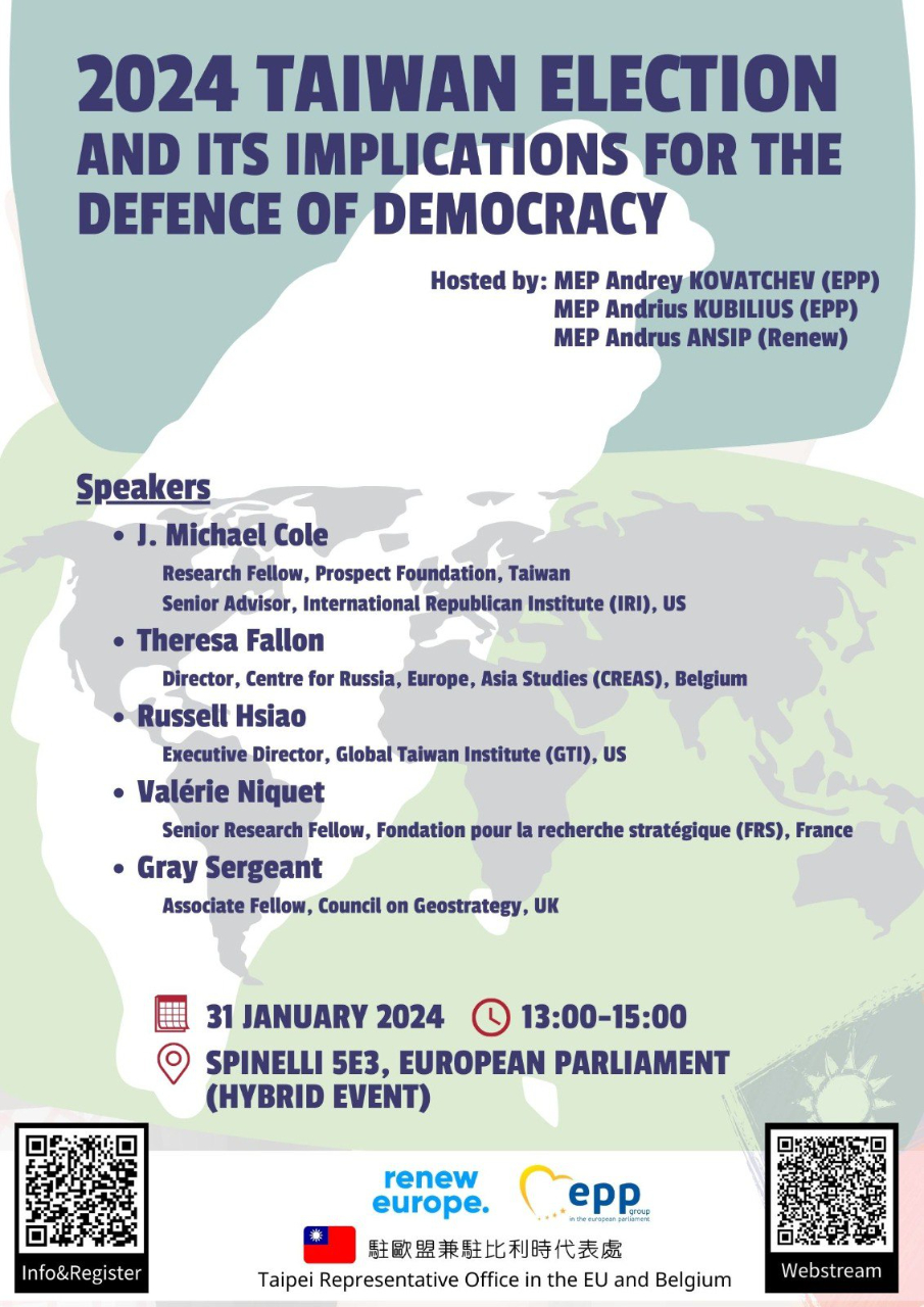 本處與歐洲議會友台小組第一副主席Andrey Kovatchev、人民黨團議員Andrius Kubilius(立陶宛前總理)及復興歐洲黨團議員Andrus Ansip(愛沙尼亞前總理)於本(2024)年1月31日在歐洲議會合辦「2024年台灣大選及對捍衛民主之意涵」研討會。