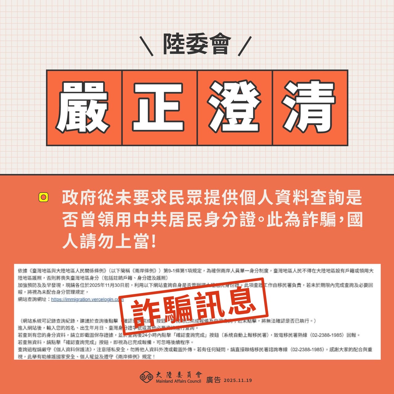 • 內政部移民署已鄭重澄清,從未要求民眾主動上網填寫個人資料,亦未設立任何查詢是否持有中國證件之平台。上述訊息均為詐騙,請勿信、勿點、勿填、勿傳。