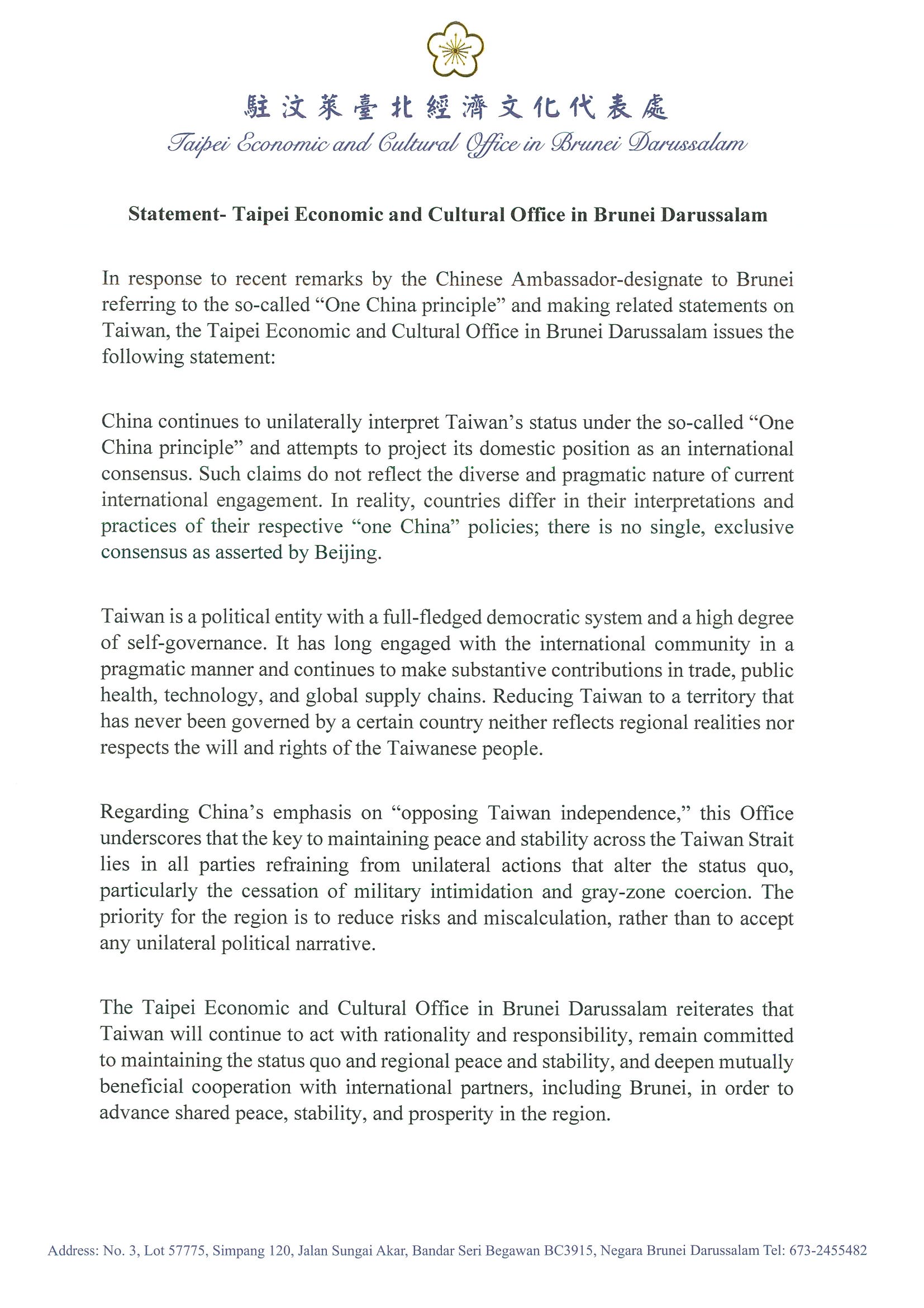 In response to recent remarks by the Chinese Ambassador-designate to Brunei referring to the so-called “One China principle” and making related statements on Taiwan, the Taipei Economic and Cultural Office in Brunei Darussalam issues the following statement: