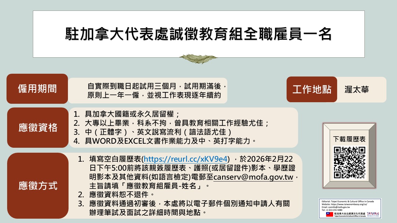 請填寫空白履歷表( https://reurl.cc/xKV9e4),於2026年2 月22日下午5:00前將該親簽履歷表、護照(或在加居留證件)影本、學歷證明影本及其他有利資料(如語言檢定證明)電郵至canserv@mofa.gov.tw 電郵主旨請填「應徵教育組雇員-姓名」。