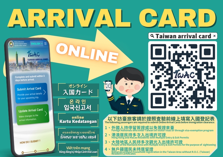 Submit your Online Arrival Card 3 days before arriving in Taiwan.