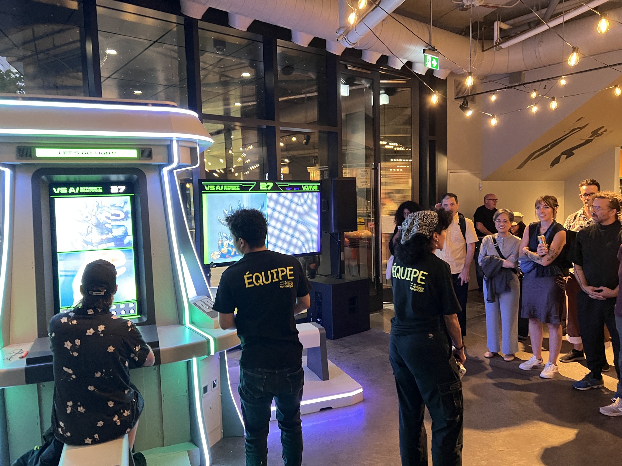 “VS AI Street fighting”utilise des technologies d’IA générative permettant à deux spectateurs de s’affronter sur une borne d’arcade en créant des images en temps réel, alliant interactivité et expression artistique.
