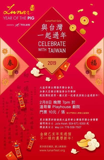 大溫哥華台灣僑界聯合會與亞裔協會合辦的大型舞台表演「與台灣一起過年」,將於二月八日星期五晚上在溫哥華Playhouse劇院演出。以台灣年節慶典等民俗為主題的50分鐘演出,全部收入將作為公益捐款給本地弱勢團體。請大家踴躍購票,一起同樂。