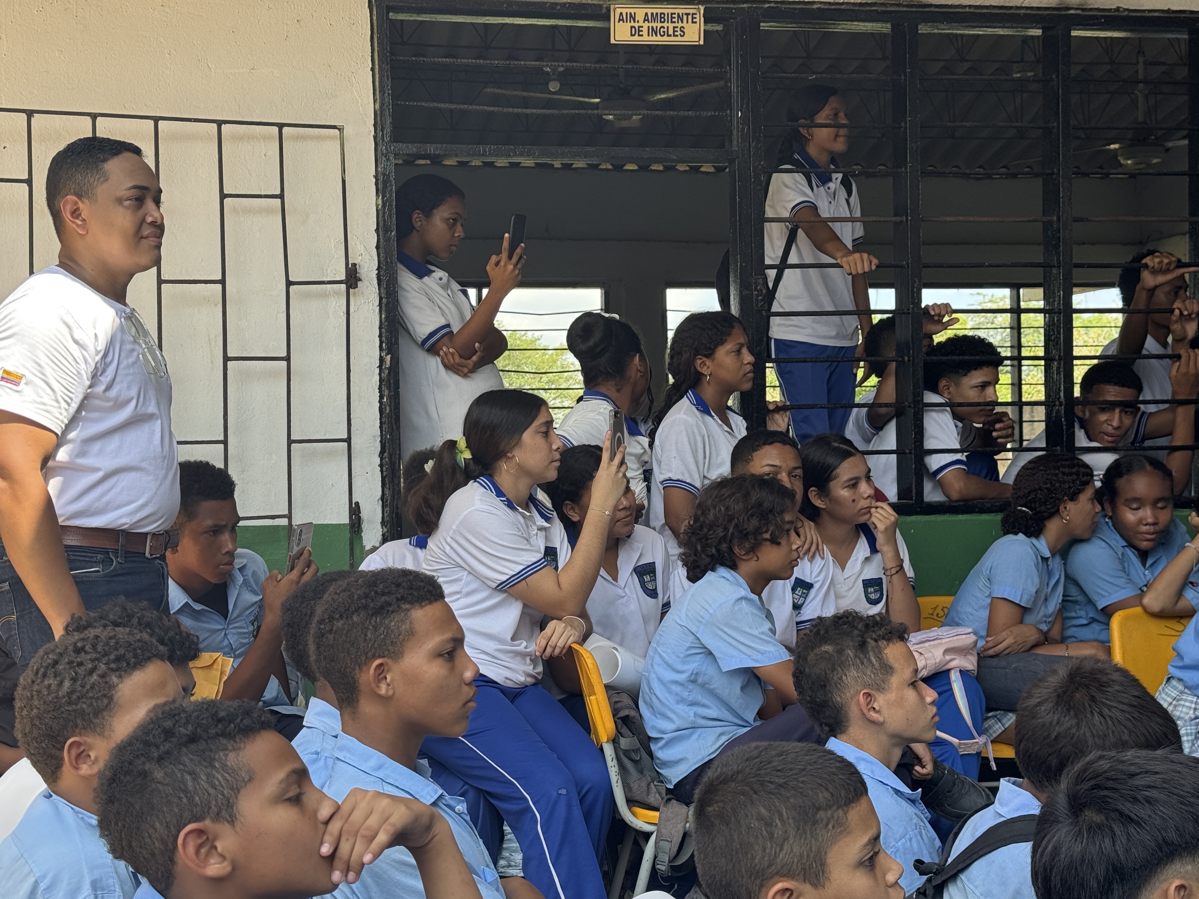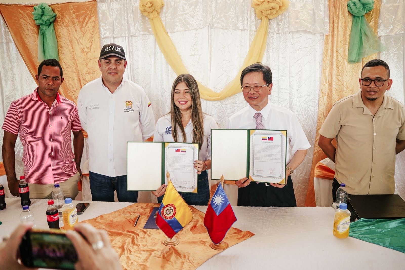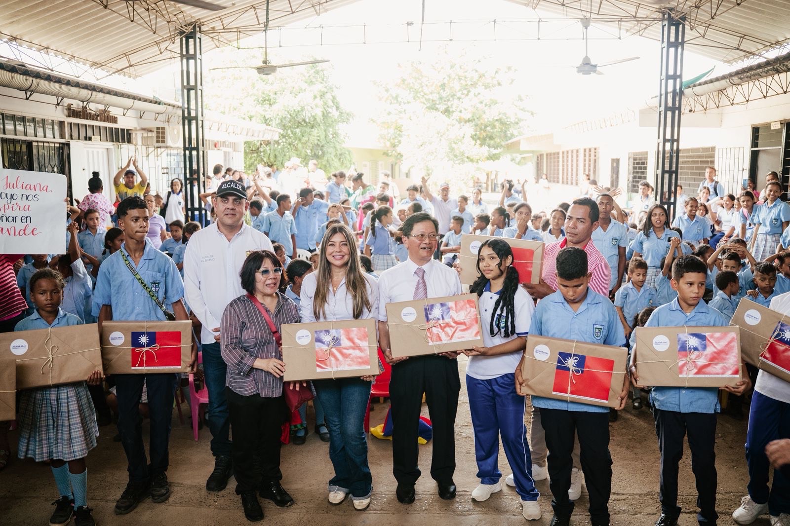 駐哥倫比亞代表處於本月6日前往哥國北部玻利瓦省(Bolivar)官摩(El Guamo)市橡樹鄉(Robles),捐贈當地 Manuel Padilla Polo 學校全新電腦設備,協助設立該校首間「數位教室」,以具體行動縮短教育資源落差,推動偏鄉地區的數位學習發展。 現場這是臺灣首次進入 El Guamo 市推動教育合作,也是該校首次獲得外國政府的支持。捐贈儀式由朱盛鴻代表親自主持,居中促成的哥倫比亞玻利瓦省選區眾議員阿拉伊(Juliana Aray)、El Guamo 市長Javier Eduardo Angulo及多位地方官員、師生與家長等約二百人出席,共同見證這一象徵友誼與希望的時刻。 活動當日,全鄉洋溢著喜慶氛圍,鄉民、家長與學生一早便在校園外列隊迎接遠道而來的貴賓,孩童們手持臺哥兩國旗揮舞歡呼,校內張掛著彩帶與花飾,宛如辦喜事般熱鬧。學童以繽紛服飾表演傳統民俗舞蹈,展現哥國北部非裔文化的活力與純真。