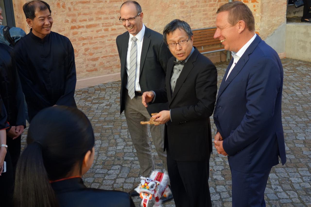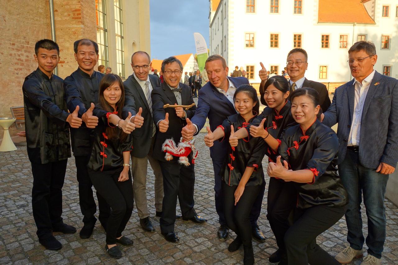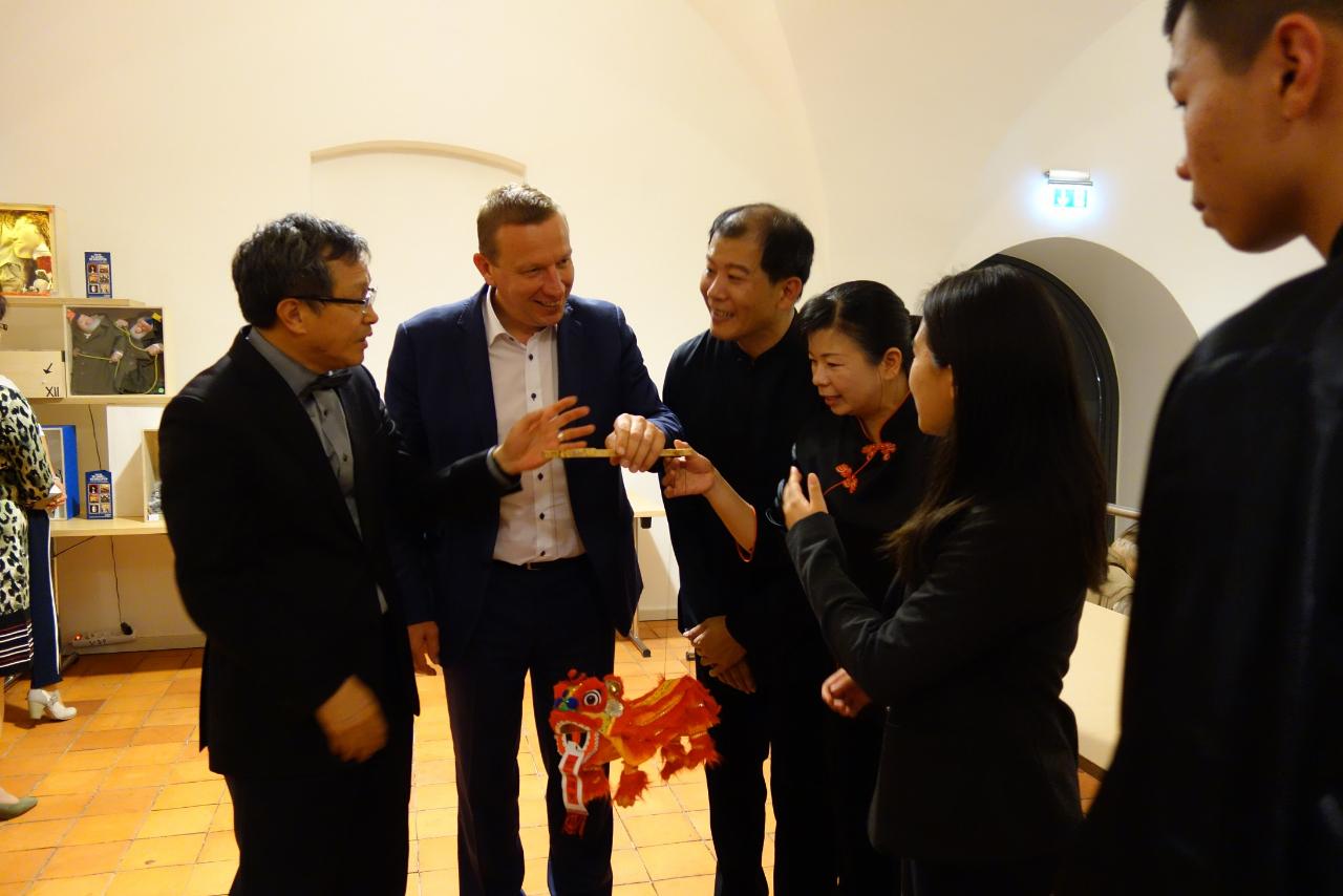 易北.埃爾斯特縣縣長亞森斯基(Christian Heinrich-Jaschinski)開幕致詞時特別感謝錦飛鳳傀儡戲劇團及謝大使的蒞臨參與,同時對臺灣文化部的大力支持由衷感謝。現場出席貴賓尚有該縣副縣長諾爾曼(Roland Neumann)及文化局長波希爾(Andreas Pöschl)。