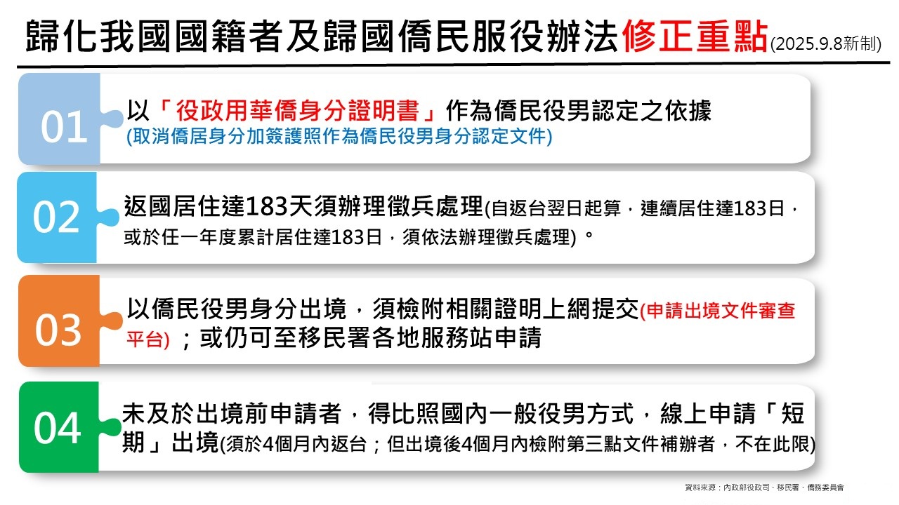 從114年9月8日開始,因內政部修正「歸化我國國籍者及歸國僑民服役辦法」,住在國外的僑民役男,回臺再出境需要先向僑務委員會申請一張「役政用華僑身分證明書」(效期自核發日起1年),再到移民署網站申請出境審查和核准。護照內頁的「僑居身分加簽」章將不能算是證明僑民役男身分的依據。