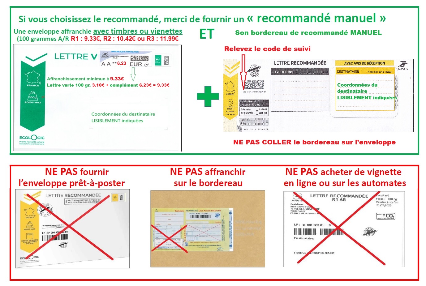RAPPEL IMPORTANT : Seul le recommandé "MANUEL" avec un bordereau établi à la main est accepté. Les recommandés "électroniques" ne sont pas acceptés (voir explications ci-dessous).