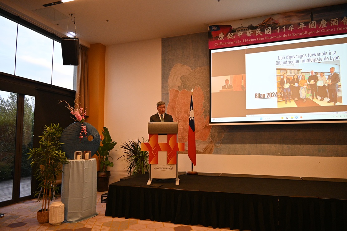 處長沈真宏致詞時細數過去一年來在南法推動各項經貿投資、文化藝術、公共安全與體育交流等領域之豐碩成果,並說明臺灣身為全球第21大經濟體、半導體及人工智慧的關鍵領航者,面對中國不斷在臺海區域發動軍演升高緊張局勢,曲解聯合國大會第2758號決議內容,意圖誤導國際社會孤立我國等圖謀,臺灣將透過合作深化與民主國家友好關係,務實擴展國際交流空間,在全球舞台上持續堅持技術創新、商貿投資、藝文合作與民主自由等普世價值,以彰顯臺灣對國際社會盡責貢獻且不可或缺的重要地位。