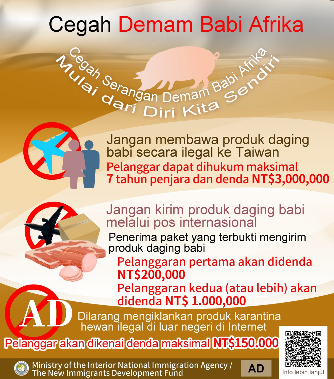 Dalam rangka mencegah demam babi Afrika, jangan membawa produk daging ke Taiwan dan jangan kirim produk daging melalui pos internasional ke Taiwan.