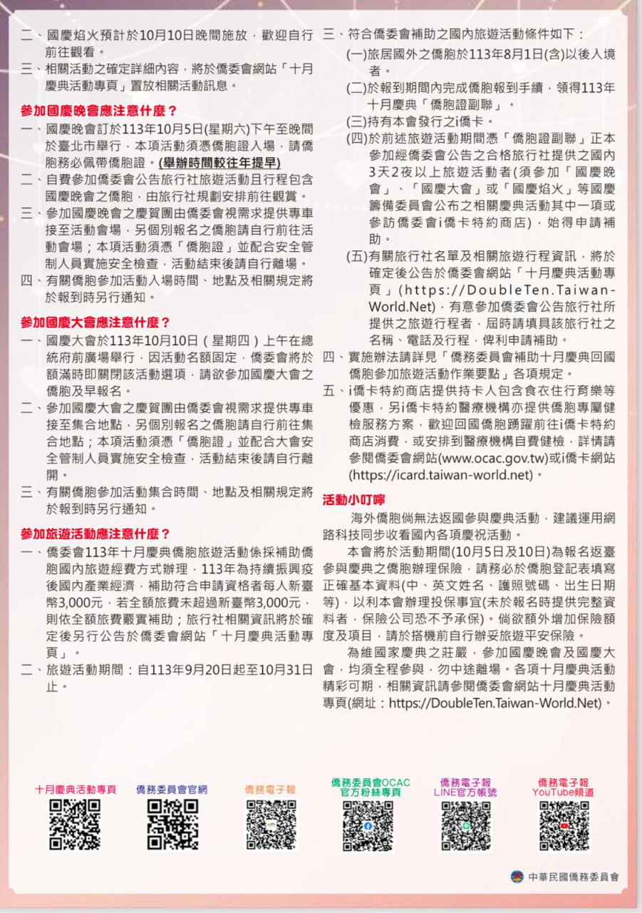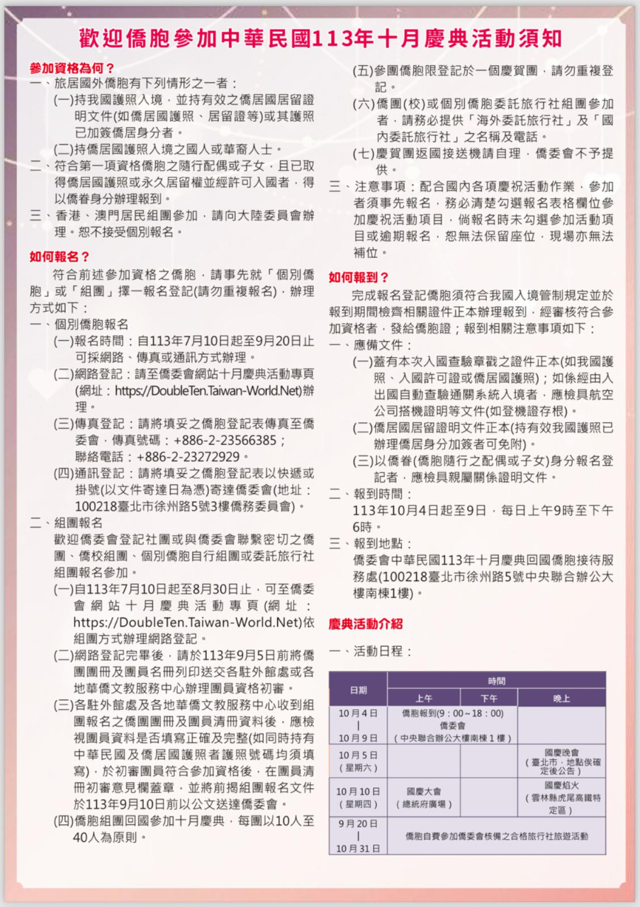 歡迎僑胞返國參加113年十月慶典活動,相關報名資訊請參閱僑委會活動須知及活動專頁