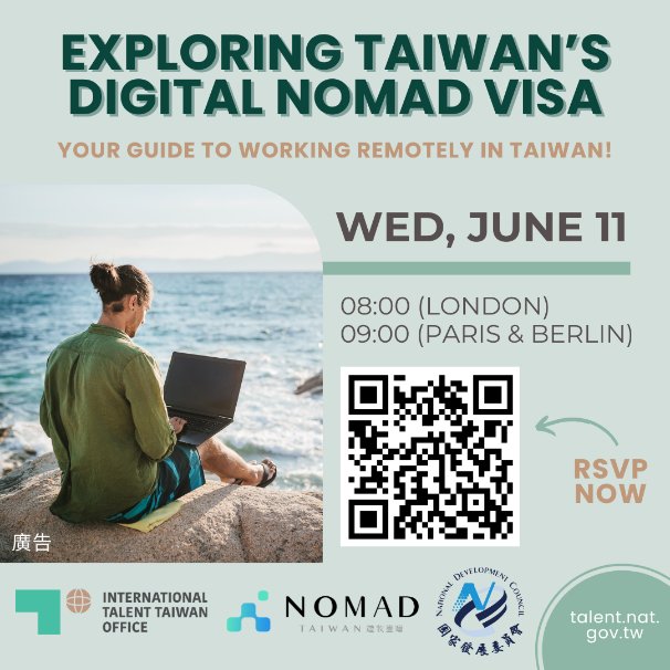 Il Webinar, sarà in lingua inglese, fornirà una panoramica completa sui requisiti di ammissione, sul processo di candidatura e sui vantaggi esclusivi di vivere a Taiwan come nomade digitale. Inoltre, ci saranno anche i nomadi digitali attualmente residenti a Taiwan a condividere le loro esperienze personali di vita e lavoro!