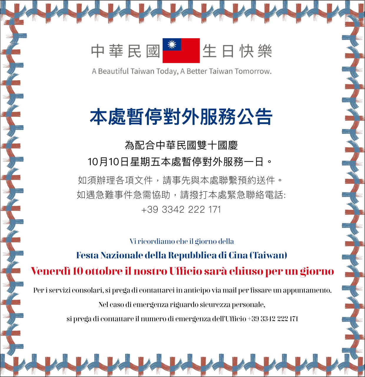 Avviso di chiusura al pubblico 10 ottobre - Ufficio di Rappresentanza di Taipei in Italia-Ufficio di Milano 駐米蘭台北辦事處 ::: Skip to main content