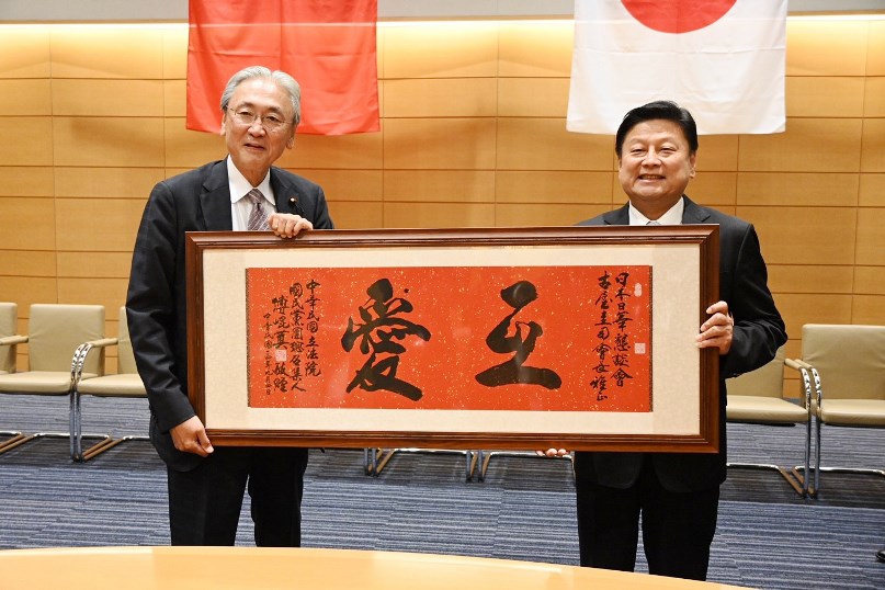 圖說: 立法院國民黨團傅總召崐萁致贈「日華議員懇談會」會長古屋圭司眾議員【互愛】匾額