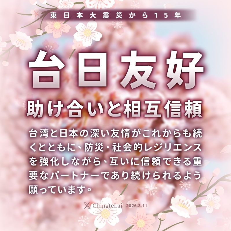写真提供:頼清徳総統Xより 頼清徳総統は、東日本大震災の発生から15年を迎える11日、自身のSNSに台湾華語のメッセージを寄せたほか、日本時間午後2時46分にX(旧Twitter)を更新して日本語のメッセージを発出した。