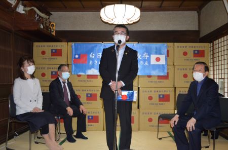 同寄贈式では林月理・僑務顧問(日本中華聯合総会前会長)、宮田功健(陳建龍)宮田歯科医院院長らが台湾側を代表し、寄贈目録を吉田信解・日台共栄首長連盟幹事長/埼玉県本庄市長に手渡した。同寄贈式には富岡勝則・朝霞市長、小野克典・桶川市長、中原恵人・吉川市長ら埼玉県内のマスク寄贈を受ける自治体の市長らも出席した。