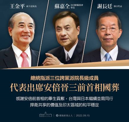 日本政府は9月27日に安倍晋三元首相の国葬を開催する。総統府報道官の張惇涵氏は15日、蔡英文総統の指示を受け、台湾日本関係協会(台湾の対日窓口機関)の蘇嘉全会長、立法院の王金平元院長(=元国会議長)、台北駐日経済文化代表処の謝長廷代表(=台湾の駐日大使に相当)の3名からなる代表団を出席させることを明らかにした。いずれも安倍元首相と親交があり、日本の各方面に幅広い人脈を持つ。