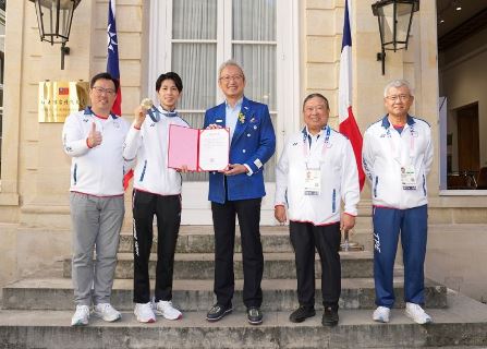 7月26日から19日間にわたって白熱した競技が繰り広げられたパリ五輪が、現地時間11日に閉会した。台湾は金メダル2個、銅メダル5個を獲得。金メダル2個は歴代1位の2004年アテネ五輪、2021年東京五輪と並ぶ成績、メダル獲得数は東京五輪の12個に次ぐ歴代2位となった。写真は現地時間11日、台北駐フランス代表処に招かれ、頼清徳総統からの祝電を受け取る林郁婷選手(左から2人目)。中央は呉志中駐仏代表。