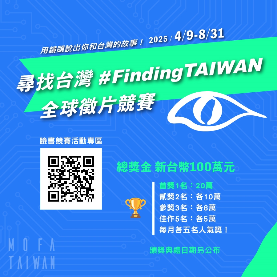 每個人眼中都有一個不一樣的台灣,也許是一碗熱騰騰的早餐、一條熟悉的街、一段讓人想念的對話。今年「尋找台灣#FindingTAIWAN全球徵片競賽」邀請你用自己的方式,記錄生活中那些微小卻真實的風景,拍下你心中最有感的台灣樣貌。總獎金高達新台幣100萬元,邀請國內外網友及創作者,用自己的方式,拍攝1分鐘短影音,呈現最觸動你的台灣意象,活動時間至台北時間8月31日止。鼓勵各界人士,包含曾應邀訪台或自行來台參與各項交流計畫或活動之人士、受獎生、僑胞等踴躍投稿。