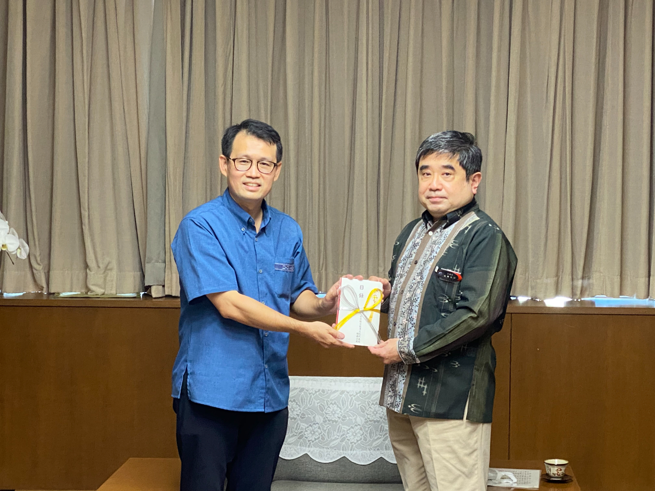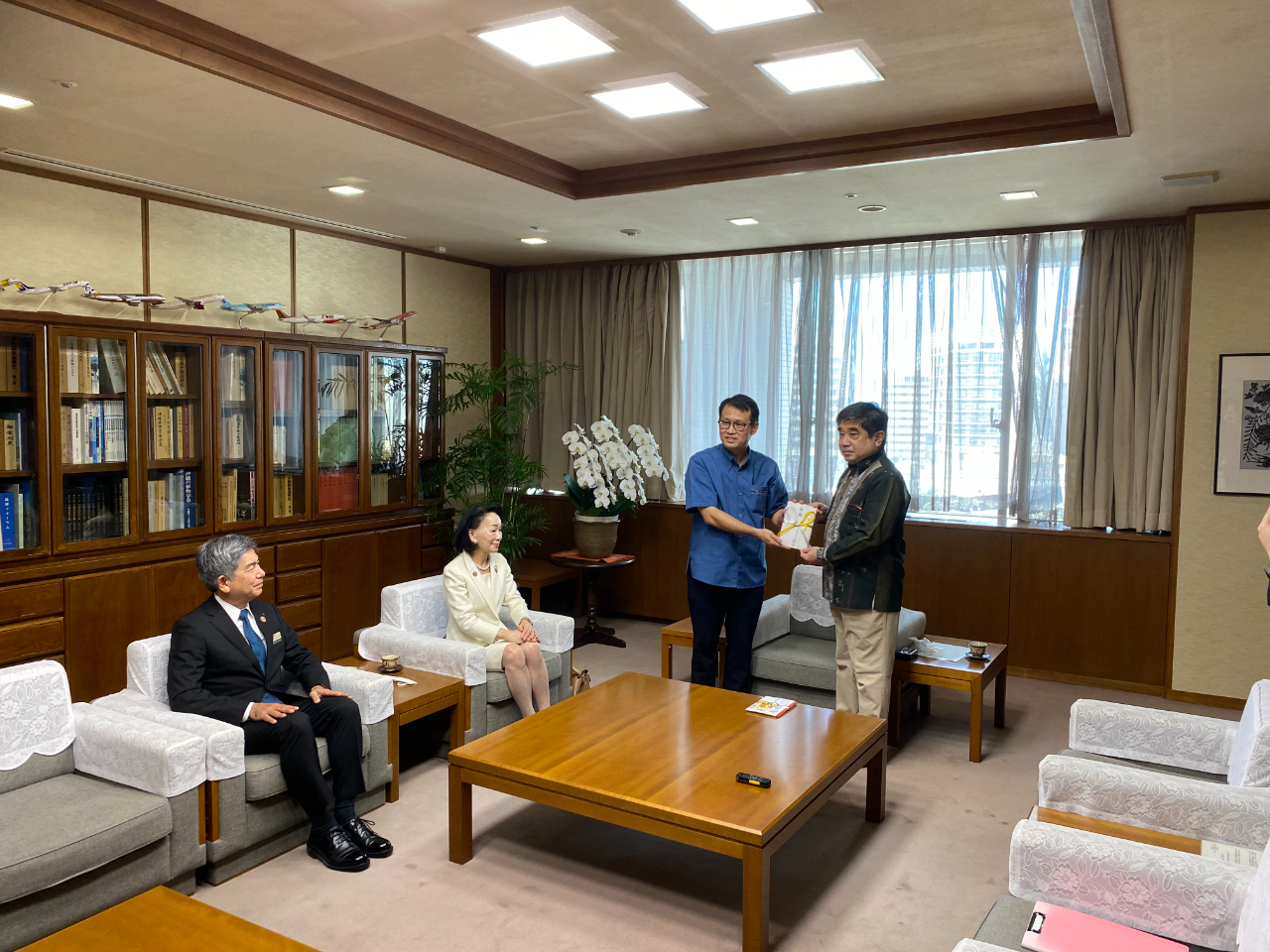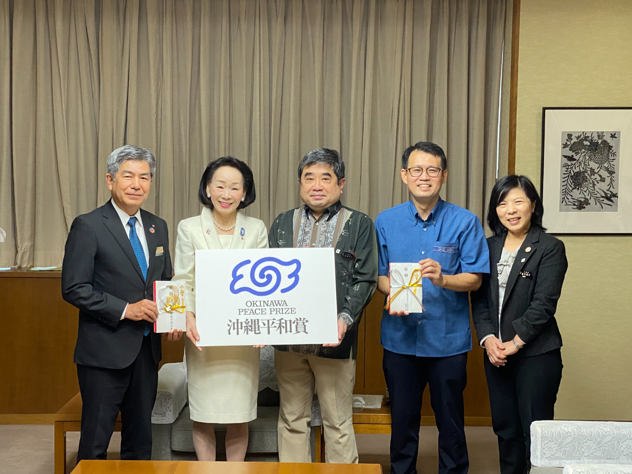 2023/03/06王瑞豐処長及び沖縄経済同友会の渕辺美紀代表幹事、川上康代代表幹事は沖縄県池田竹州副知事を訪ね、沖縄和平賞の活動基金を贈呈しました。