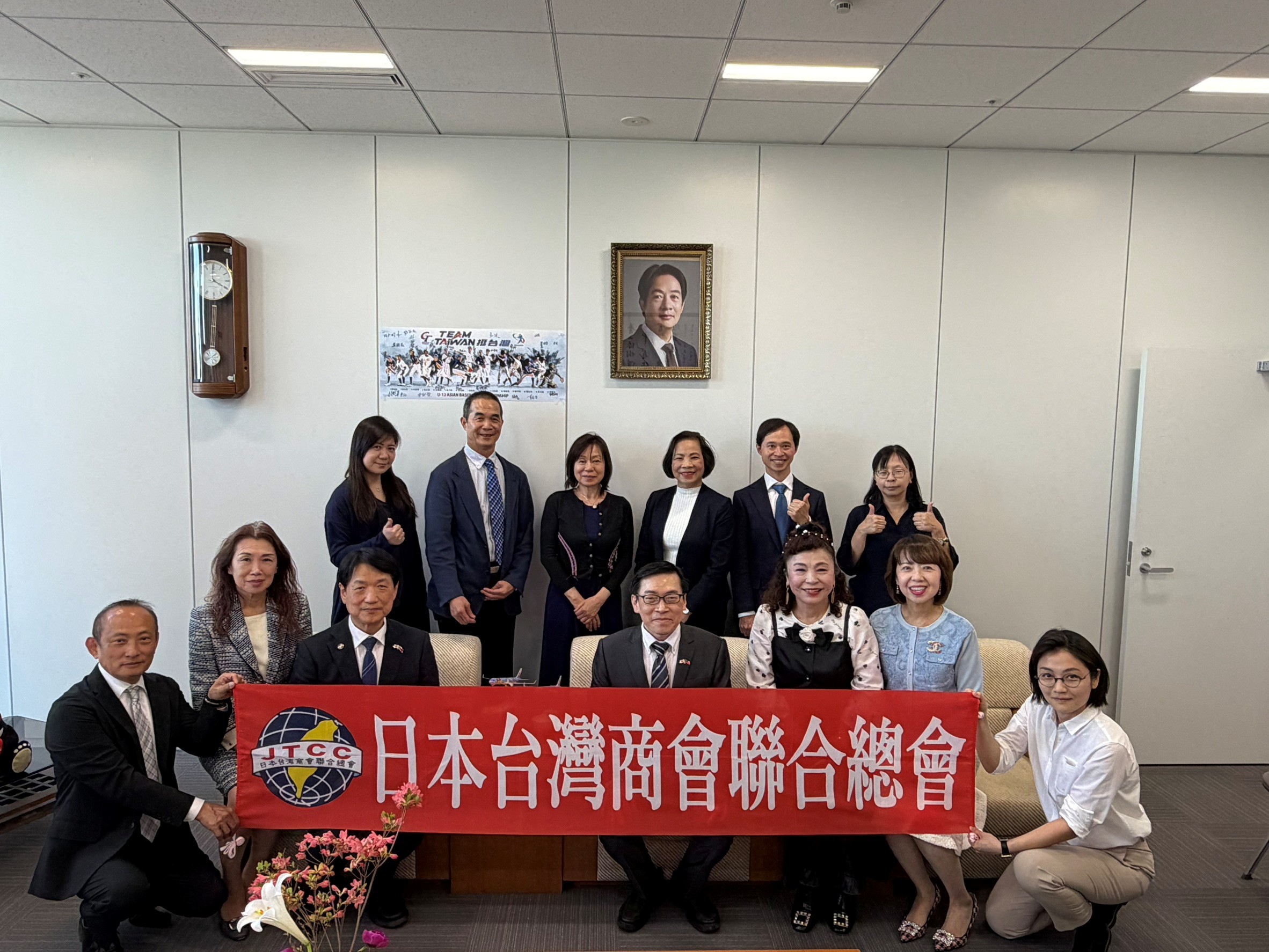 2026年4月21日范振國處長(前排中)接見日本台灣商會聯合總會賴本勉總會長(前排左三)及謝美香國策顧問(前排右三)等人,雙方就我國僑務工作推動現況及旅日台商發展等交換意見,黃麗婷秘書在座。