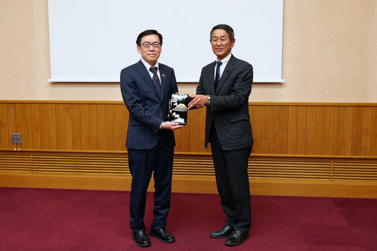 范処長(左)と静岡県議会日台友好議員連盟の宮沢正美会長(右)