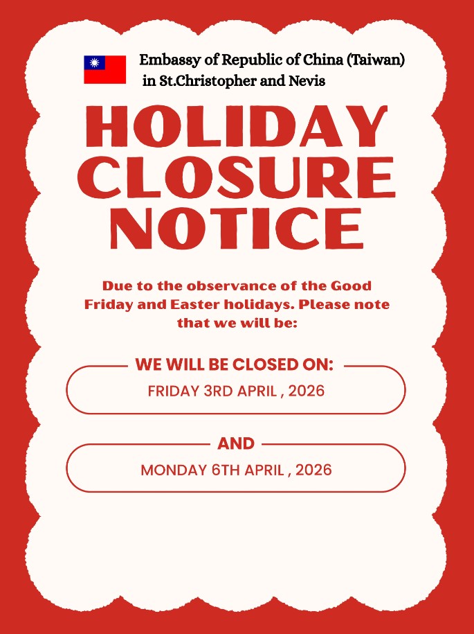 Embassy Closure Notice: April 3 and April 6 - Embassy of the Republic of China (Taiwan) in Saint Christopher and Nevis 駐聖克里斯多福及尼維斯大使館 ::: Skip to main content