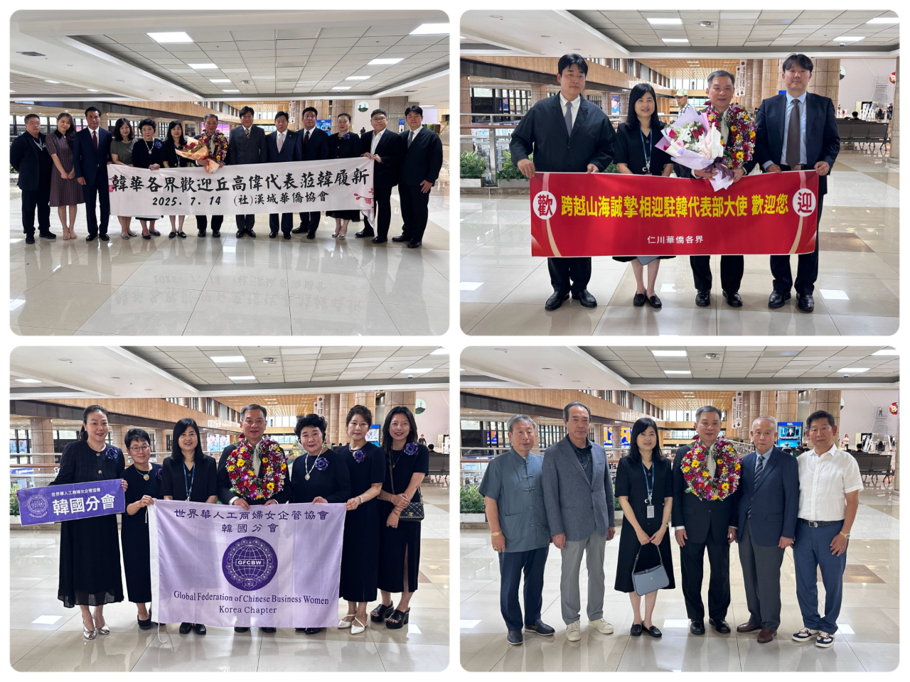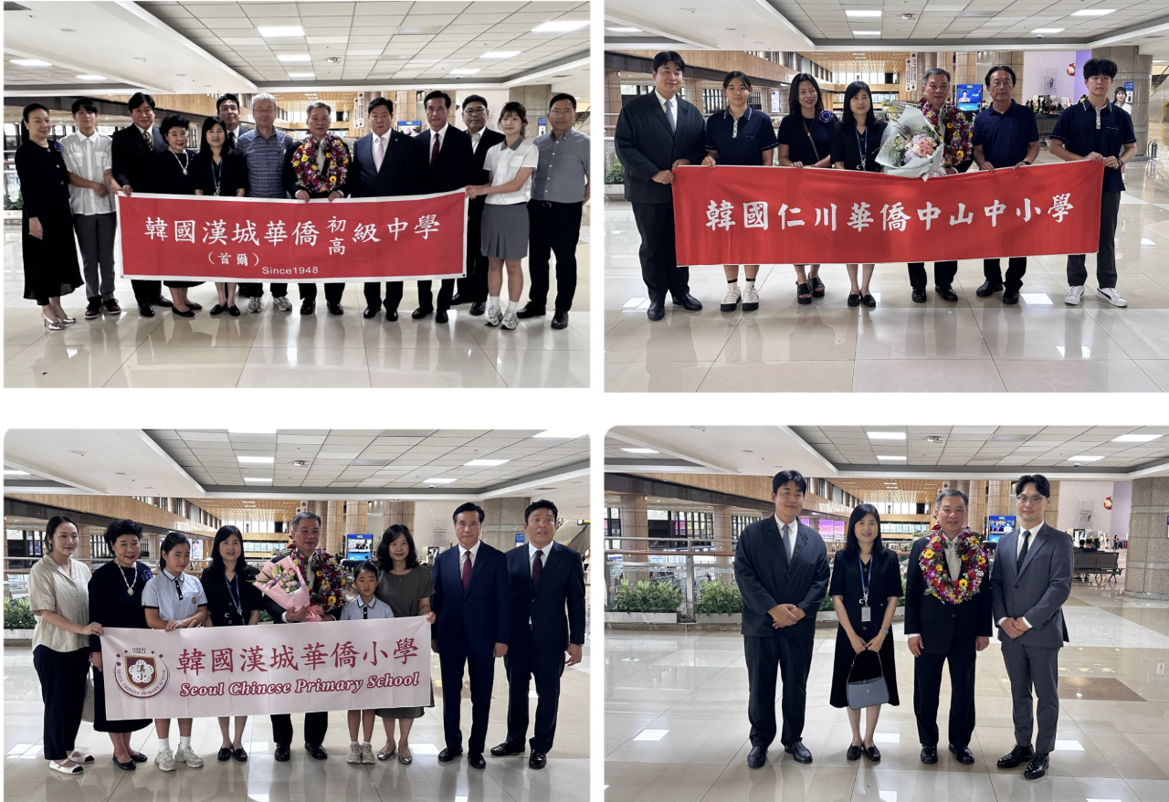 到場迎接之僑團校包含漢城華僑協會李中漢會長、漢城華僑中學譚紹榮理事長、于植盛校長、漢城華僑小學郭美華校長、永登浦華僑協會喬聚東會長、永登浦華僑小學劉家棟董事長、仁川華僑協會周禧豐副會長、仁川華僑中山中小學慕思亮校長、世華工商婦女企管協會韓國分會崔愛英會長、韓國華僑協會聯合總會青年會何紹榮會長、姜寧瑋行政院政務顧問等共約40餘位僑團負責人及代表。