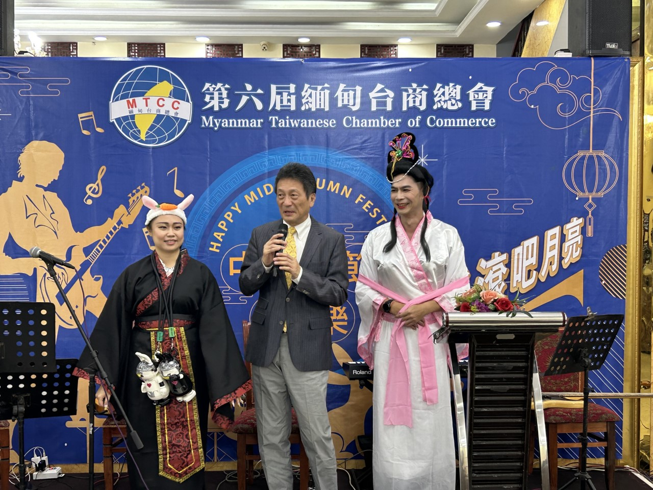 周大使致詞表示,中秋節是傳統中國節日中最富詩情畫意的節慶,特別感謝緬甸臺商總會用心安排,尤其是黃敬棋、留鈺茹2位副秘書長分別盛粧扮演嫦娥、吳剛粉墨登場以娛嘉賓,更可看出大家對僑社的付出。從農曆過年、端午、中秋並安排訪視關心旅緬臺資企業,對凝聚僑心,貢獻卓著,盼未來能繼續提供建言,讓本處工作更為精進、更便民。