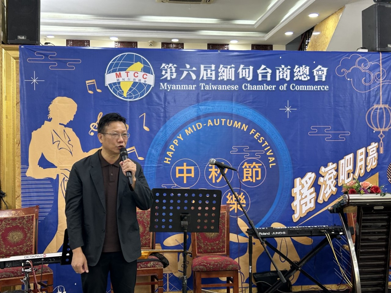 緬甸臺商總會於9月24日晚間舉辦「搖滾吧月亮中秋節晚會」,本處周大使偕本處員眷應邀出席,晚會由羅振華秘書長主持,計150位旅緬臺商及眷屬共慶中秋佳節。