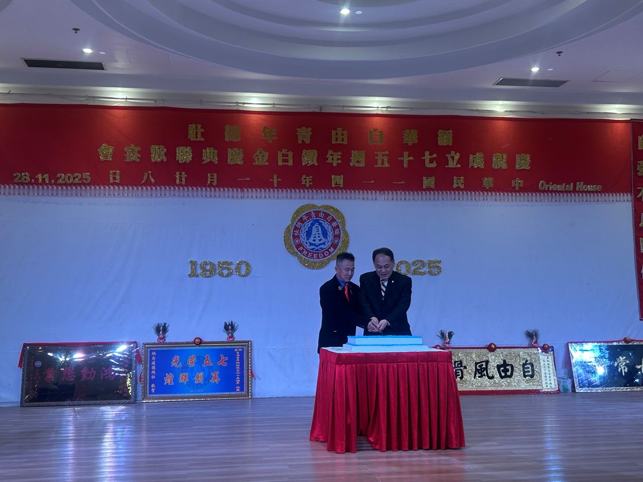 緬華自由青年總社於本(114)年11月28日晚間在仰光Oriental House餐廳舉行75週年社慶聯歡會,尤福臨理事長感謝緬華各僑社代表近500人到場參加,駐緬甸代表處黃敏境代表夫婦與僑務組林冠宏組長亦前往祝賀。