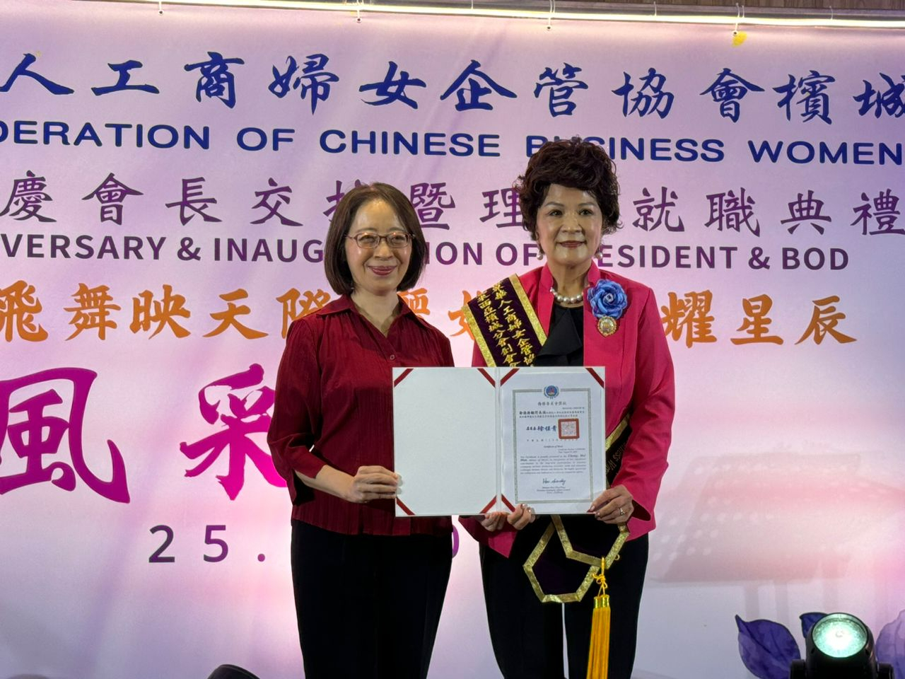 此外,僑務組楊修瑋組長亦在活動中代表僑委會徐佳青委員長頒發賀狀予新任陳麗娟會長,期許在陳會長的帶領下世華檳城分會會務再創高峰!