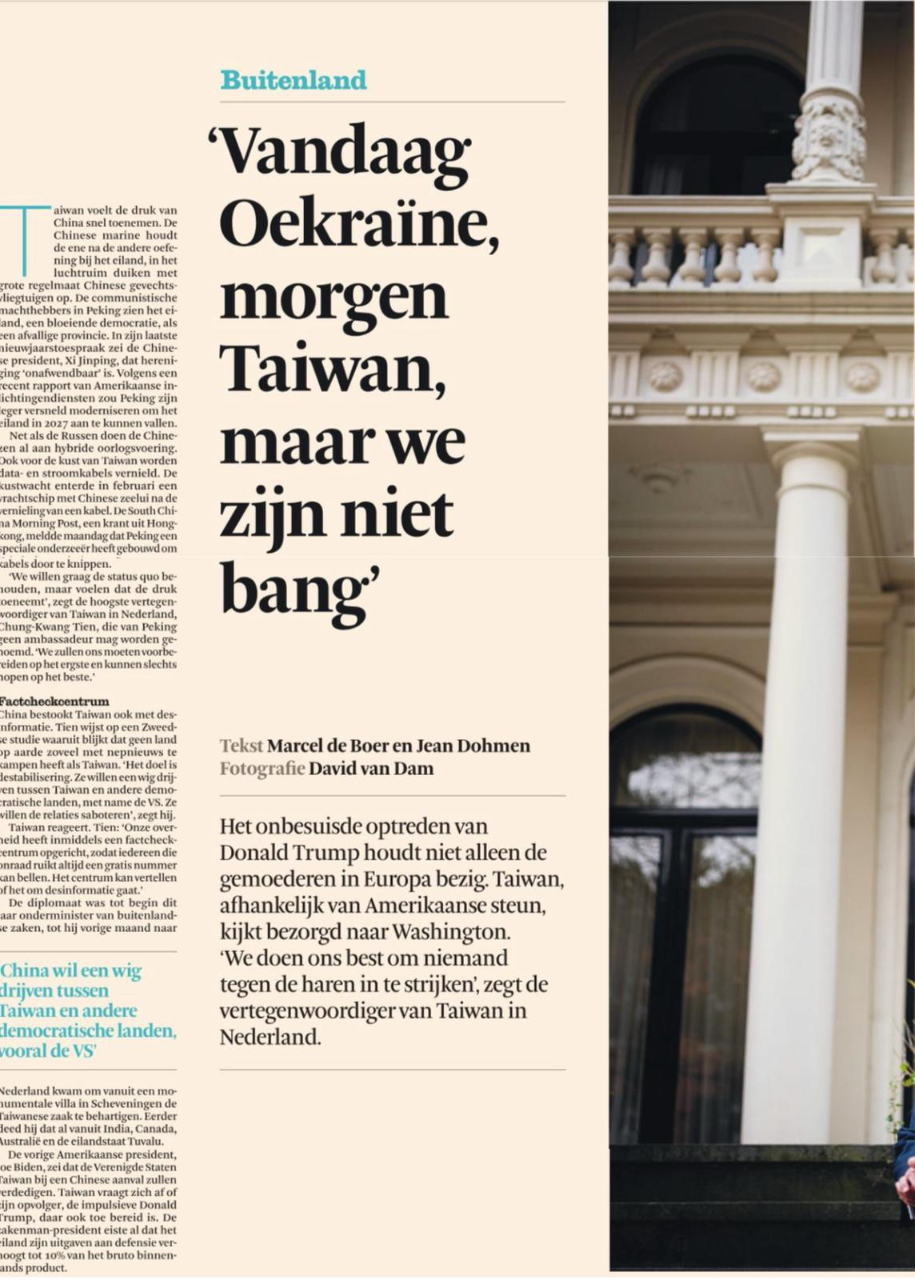 荷蘭主流媒體《金融日報》(Het Financieele Dagblad)3月28日以「今日烏克蘭,明日臺灣,但我們並不畏懼」為題,罕見以兩頁全版篇幅刊出駐荷代表田中光專訪,指出中國對台威脅與日俱增,臺灣不願挑釁任何人,但仍將「為最壞情況做好準備,並盼能有最好結果」。臺灣與荷蘭及歐盟共享諸多理念價值並有緊密經貿合作,盼雙邊能儘早洽簽「經濟夥伴協定」(Economic Partnership Agreement, EPA),進一步深化彼此關係。