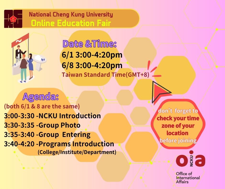 In lieu of this, we are cordially inviting you to register: https://reurl.cc/eXgYWR, and join the virtual introduction of our university, National Cheng Kung University, this June 1st and 8th, 2023, 3 pm via Webex: https://reurl.cc/gZ35lQ