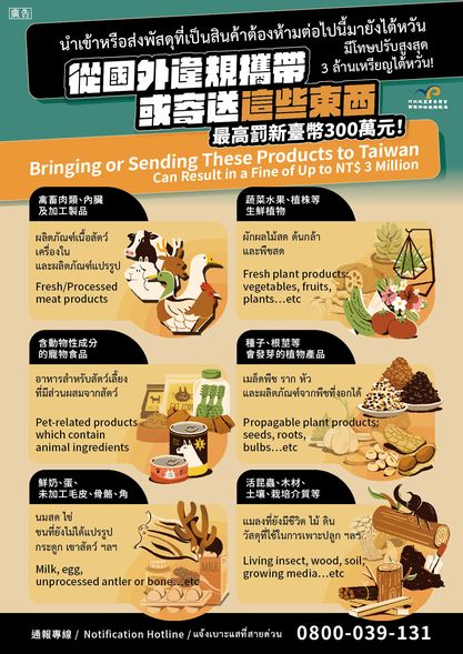 為防範非洲豬瘟等重大動物傳染病入侵台灣,嚴禁自國外攜帶或寄送違規動植物檢疫品,維護我國農業生產安全。