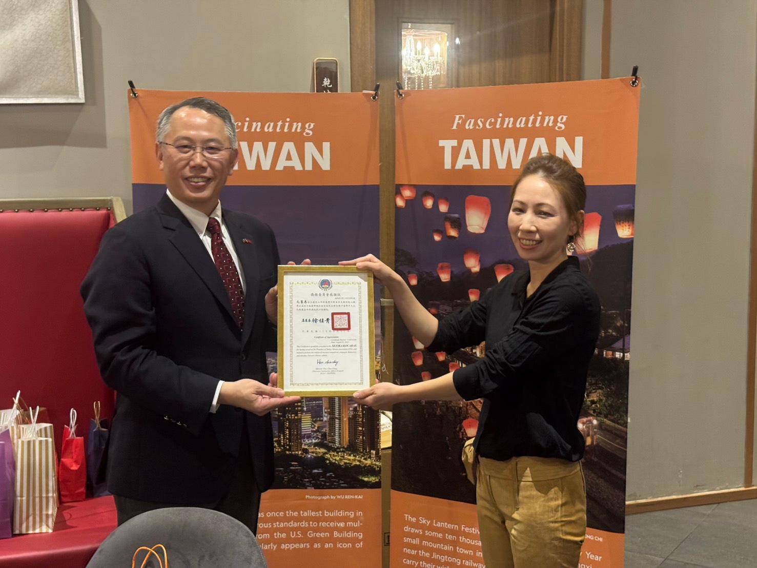 黃代表在餐會中代表僑務委員會委員長徐佳青頒發賀狀給張家蘭僑務顧問,恭賀榮膺歐洲台灣商會聯合總會監事長一職,實為土國僑界之光!