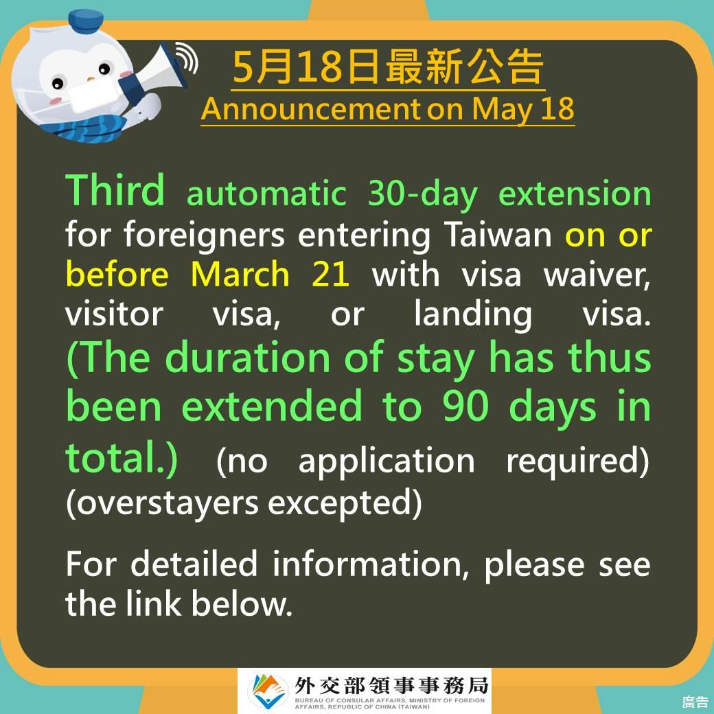 Tayvan e-vizesine sahip olan ve Tayvan'a girmiş olan yabancılar için, e-vizesi otomatik olarak bir daha 30 gün uzatılacak.
