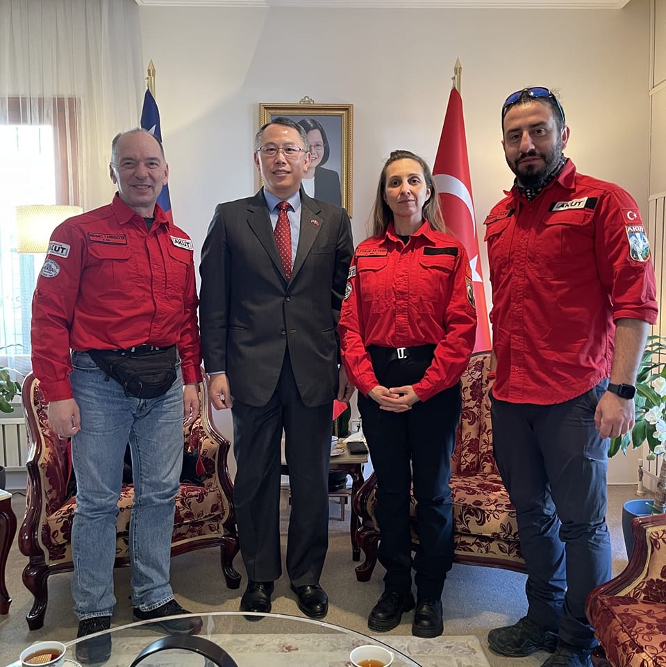 Türkiye Arama Kurtarma Derneği AKUT Başkanı Zeynep Yosun Akverdi ve kurucularından ve acil durum direktörü Adam Mehmet Tanrısever'i Tayvan'ın bağışlarını nasıl değerlendirileceğini görüşmek üzere ofisimizde ağırladık. Acil afet yardımları, arama ve kurtarma yeteneklerini geliştirme, uluslararası bir eğitim merkezi kurulması, deprem önleme eğitimleri ve Tayvan ile uluslararası ve arama kurtarma işbirliği ve alışverişi konuşulan konular arasında yer aldı.