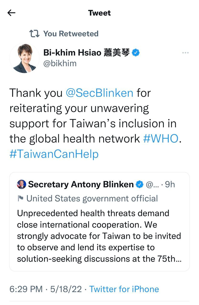 感謝美國國務卿布林肯、發言人Ned Price及國務組織事務局助卿Michele Sison支持台灣參加「世界衛生大會」(WHA)