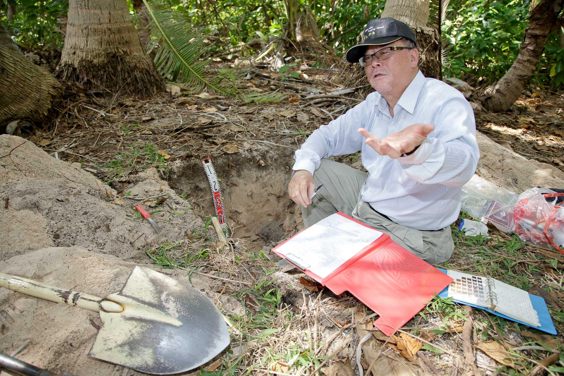 在土壤資源調查部分,依島上5個不同土地用途,包括草生地區、椰子樹生長區、種菜區、海岸林區與灌木區,分別挖取土壤剖面進行調查,以了解土壤基本特性及形態特徵,並進行土壤樣品取樣與依需要進行實驗室分析。調查結果顯示,當地土壤是自然化育而成,可供原生植物生長及農作物生產使用。島上土壤之組成與剖面特性主要有兩類土壤。第一類土壤主要存在於太平島外緣,表土灰黑色,富含枯枝落葉,下層無鳥糞層,其表土20公分主要為粗砂夾雜植物枯枝落葉,有土壤構造,富含植物根,具石灰質性質,20至60公分深度為珊瑚礁風化物質。第二類土壤主要存在於太平島內緣,表土黑色,富含枯枝落葉,20公分以下有鳥糞層特性,其表土40公分內主要為砂土混雜枯枝落葉,夾雜棕色塊狀鳥糞,有完整土壤構造,有機質含量較高且富含植物根,具石灰質性質。上述兩類自然化育土壤均可供天然林及農作物生長。