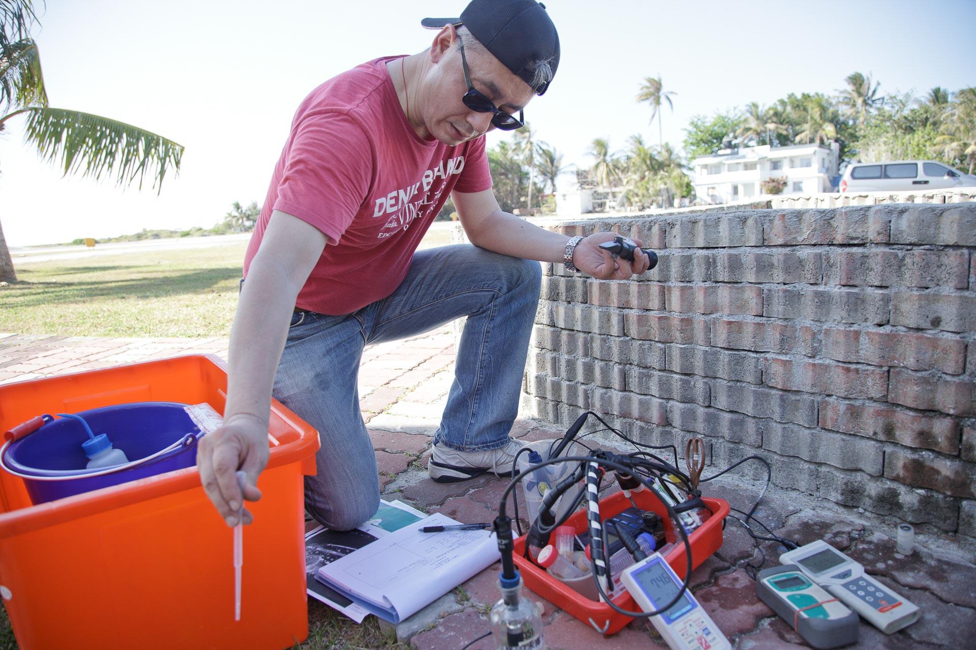 本次調查團進行登島調查,在水文水質調查部分,目前太平島上可供抽用地下水之水井共計4口,經過採樣檢測分析結果顯示,其中一口井地下水水溫約為28℃,導電度為838μmho/cm,總溶解性固體為418mg/L,根據以上數據判斷島上水源為淡水,可以供人飲用,且較澎湖本島之地下水質為佳。
