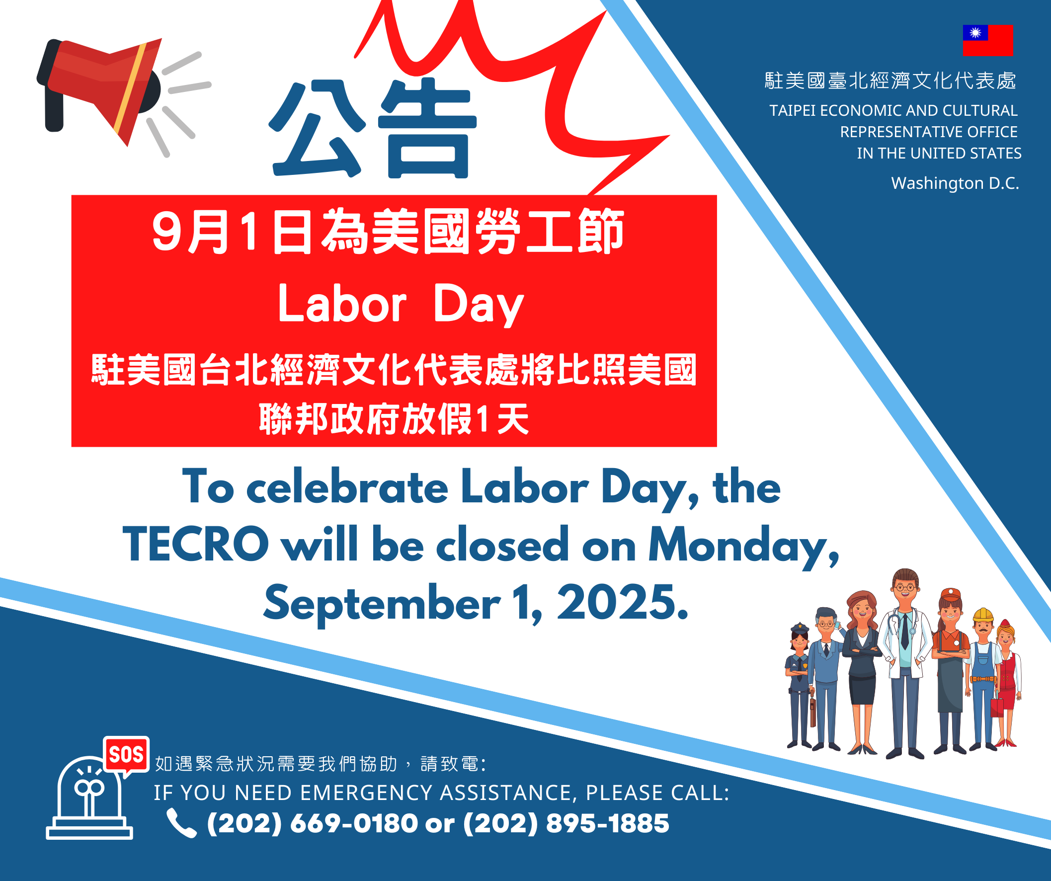 Taipei Economic and Cultural Representative Office in the United States20250901勞工節休假
