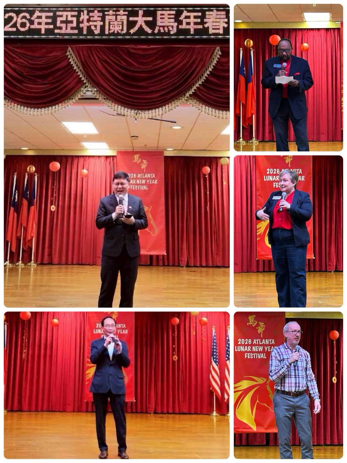 上午開幕典禮由臺美學校擊鼓及精彩民俗舞蹈揭開序幕。活動召集人陸復泰僑務委員、林主恩處長,以及喬州州參議員 Michael Rhett、眾議員 Karen Lupton、Chamblee City市長 Brian Mock 等貴賓相繼致詞向現場民眾拜年。林處長致詞時向僑界及來賓祝賀新年快樂、馬年行大運。他表示,十二生肖中的馬象徵速度與行動力,祝福大家「馬上發財、馬上健康、馬上快樂」,並期許新的一年人人如駿馬般充滿能量與活力。今年並特別邀請主流貴賓共同揮毫,書寫「一馬當先行春回大地納鴻福」,為活動增添文化雅趣與新春祝福。