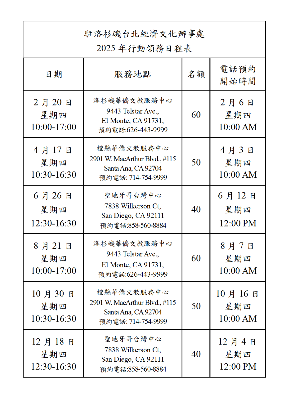 為持續服務洛杉磯、橙縣及聖地牙哥地區僑民,本處規劃2025年全年度於「洛杉磯華僑文教服務中心」、「橙縣華僑文教服務中心」及「聖地牙哥台灣中心」辦理行動領務程期,受理民眾申辦「換發護照」及「授權書(委任書)」、「退休俸授權(申請)書」及「現居美國證明書」等文件驗證申請案,辦理日期、服務地點及名額請詳下方日程表,請擬申辦之僑民於「電話預約開始時間」起,向各服務地點電話預約。