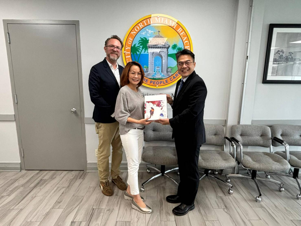 周處長日前與北邁阿密海灘市(North Miami Beach)副市長Lynn Su及該市社區重建機構(Community Redevelopment Agency)執行長Adam Old會晤 ,就該市未來的成長與發展藍圖深入交換意見。雙方也重申將持續推動台灣與北邁阿密海灘在文化、經濟與外交領域的交流與合作。 北邁阿密海灘市與桃園平鎮為姊妹市,此次互動不僅強化雙邊情誼,也為未來更多合作開啟契機。