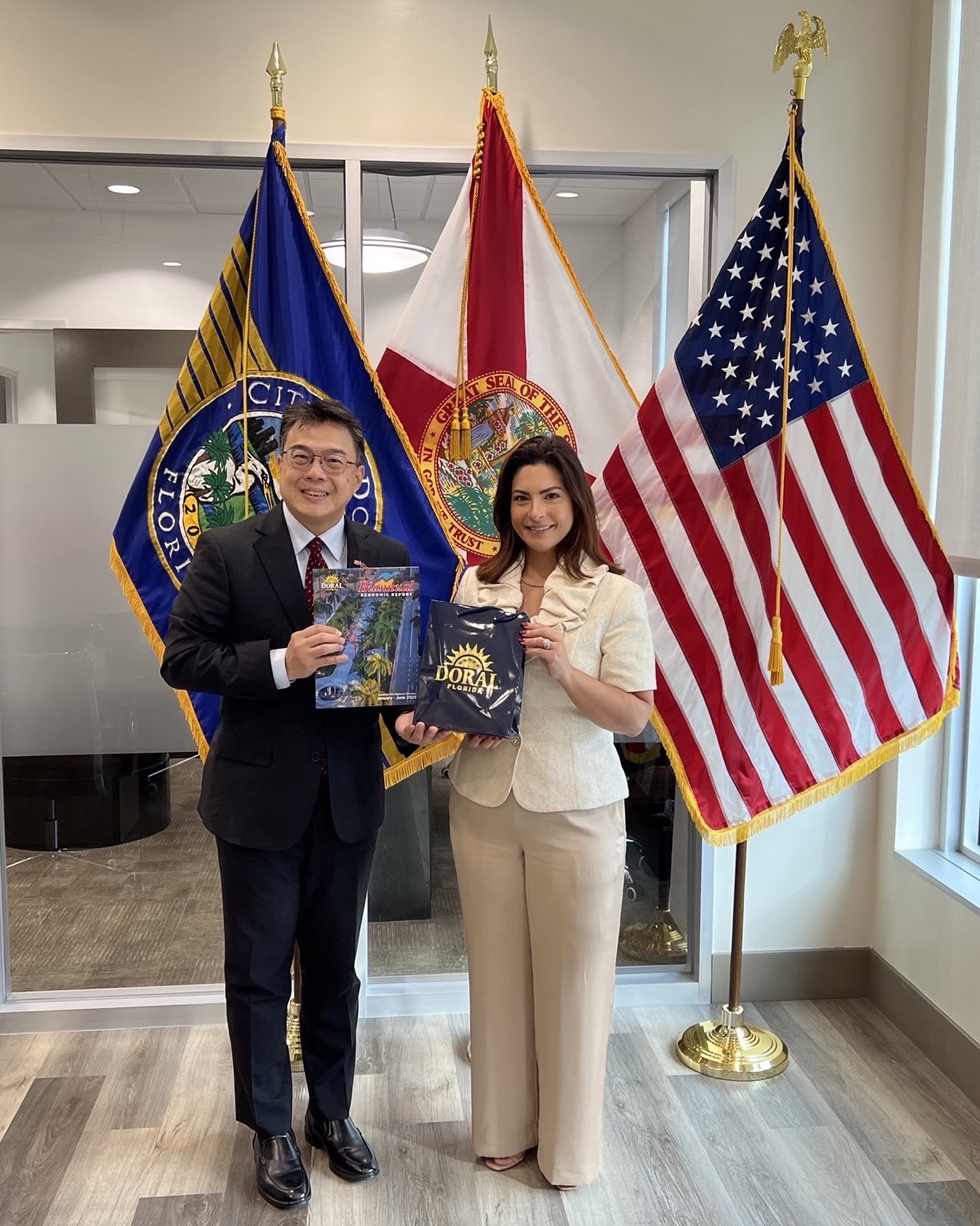 周處長應邀赴都瑞爾市(City of Doral)市府會晤市長 Christi Fraga,就強化該市與我姊妹市新北市汐止區關係、邀請 Fraga 市長參加我「2026 年智慧城市展」、促進文化交流及該市明年舉辦國際活動等議題交換意見。