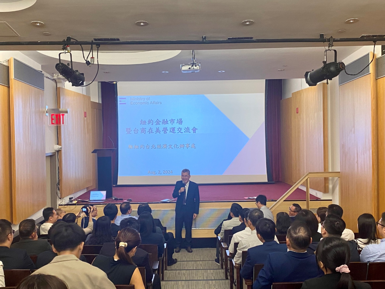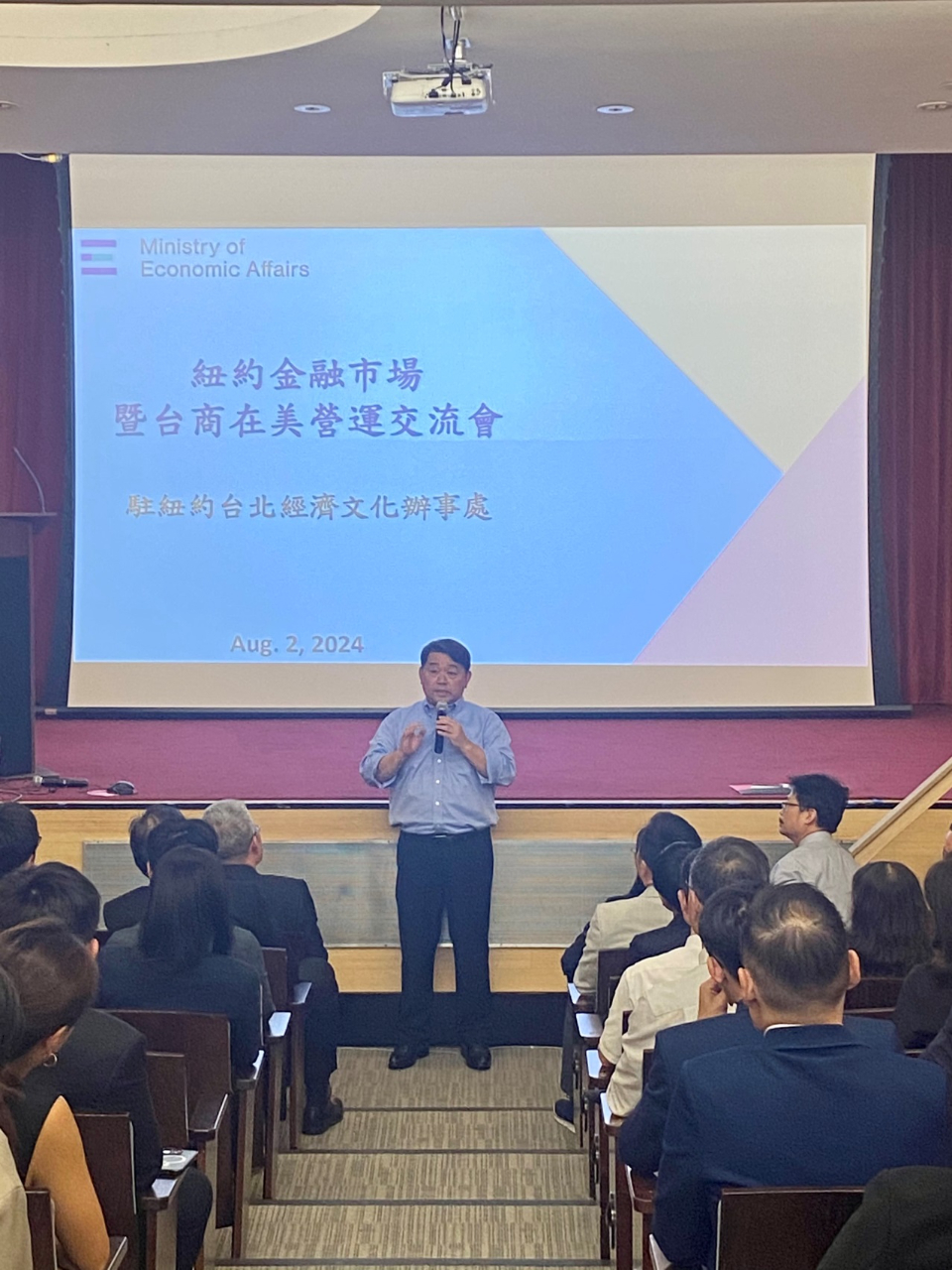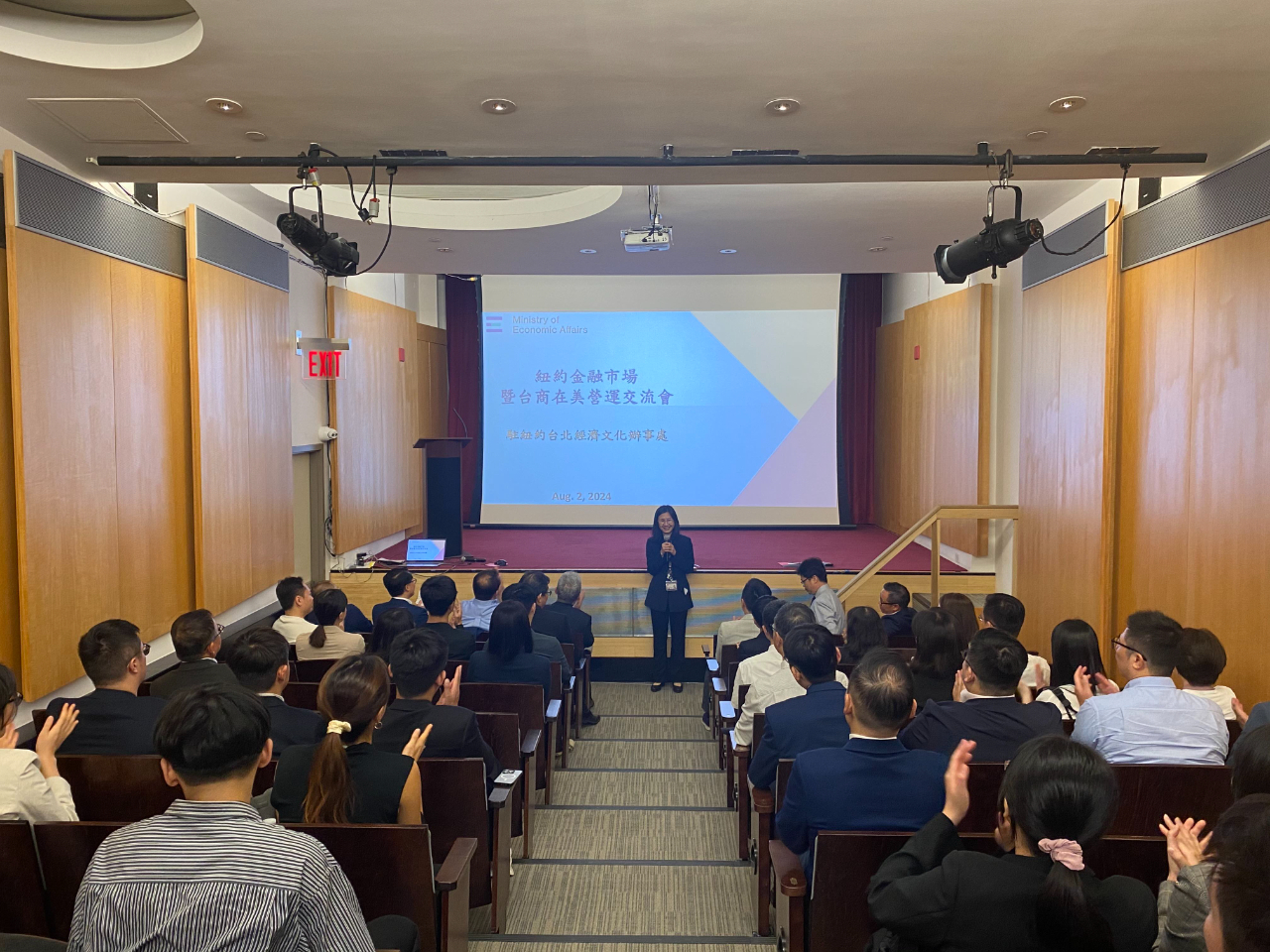 駐紐約台北經濟文化辦事處配合政治大學國際金融碩士學程前來紐約海外研習,於8月2日舉辦「紐約金融市場暨台商在美營運交流會」,邀請花旗銀行全球電子交易風險營運長呂偉誠分享美國金融產業最新趨勢,紐約台灣商會暨青商會,以及紐約當地金融機構及台資銀行代表逾50人出席。