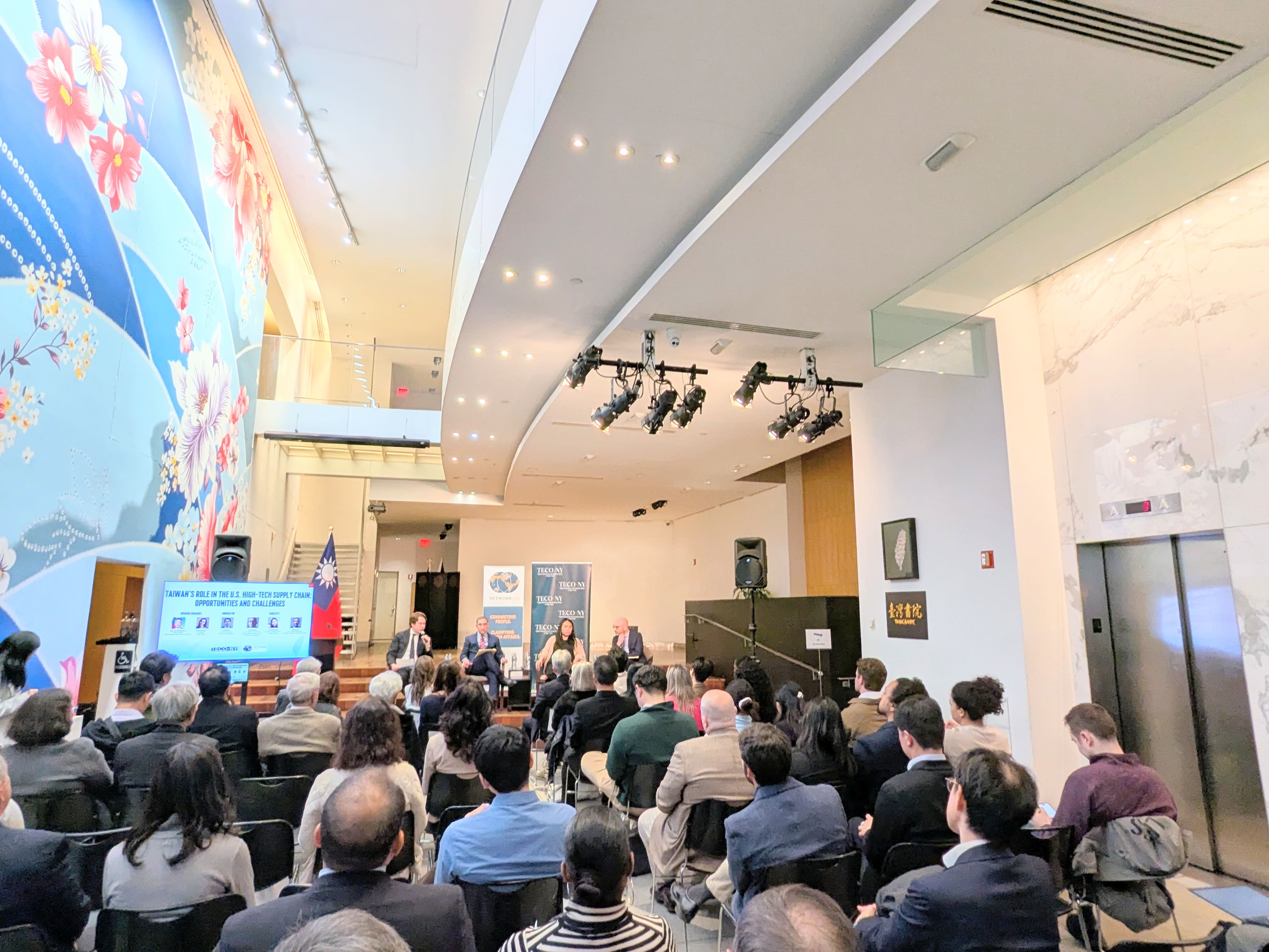駐紐約台北經濟文化辦事處4月6日晚間與紐約智庫「Network 20/20」合辦「台灣在美國高科技供應鏈中的角色:機會與挑戰」(Taiwan's Role in the U.S. High-Tech Supply Chain: Opportunities and Challenges)座談會,由「外交關係協會」(Council on Foreign Relations)亞洲研究員石可為(David Sacks)主持,該會新興技術與國家安全講座教授暨數位與網路空間政策計畫主任Adam Segal、天普大學(Temple University)政治學教授暨「科技、民主與社會研究中心」海外資深研究員薛媖月(Roselyn Hsueh),及華府智庫「資訊科技與創新基金會」(Information Technology and Innovation Foundation, ITIF)全球創新政策副總裁Stephen Ezell擔任與談人,我邦交國駐紐約及外交使節團官員、智庫、學界及企業界人士、中外文媒體記者共約80餘人出席,現場互動及提問氣氛熱絡。